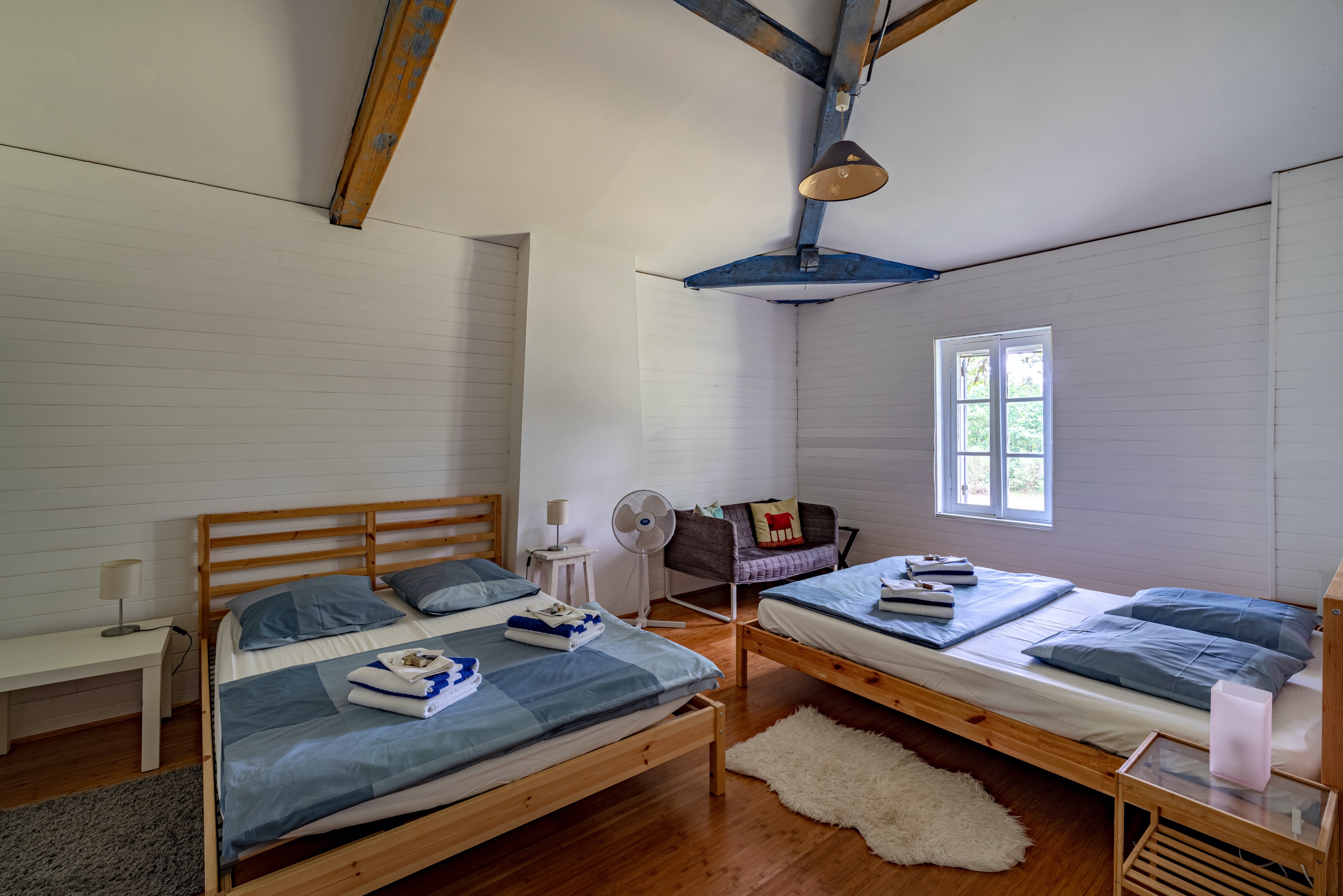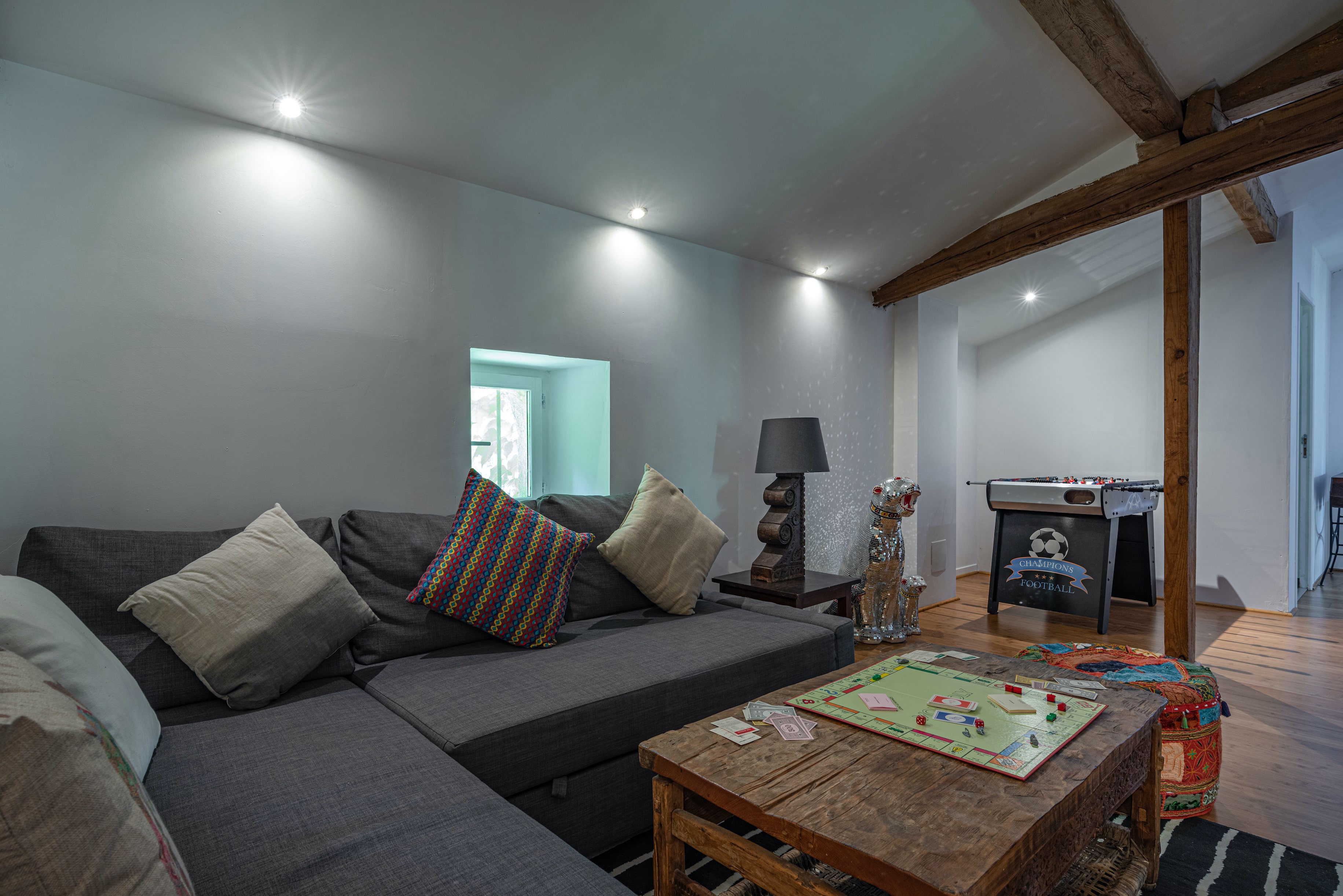 Central hallway upstairs with sitting area, double sofabed, and foosball.